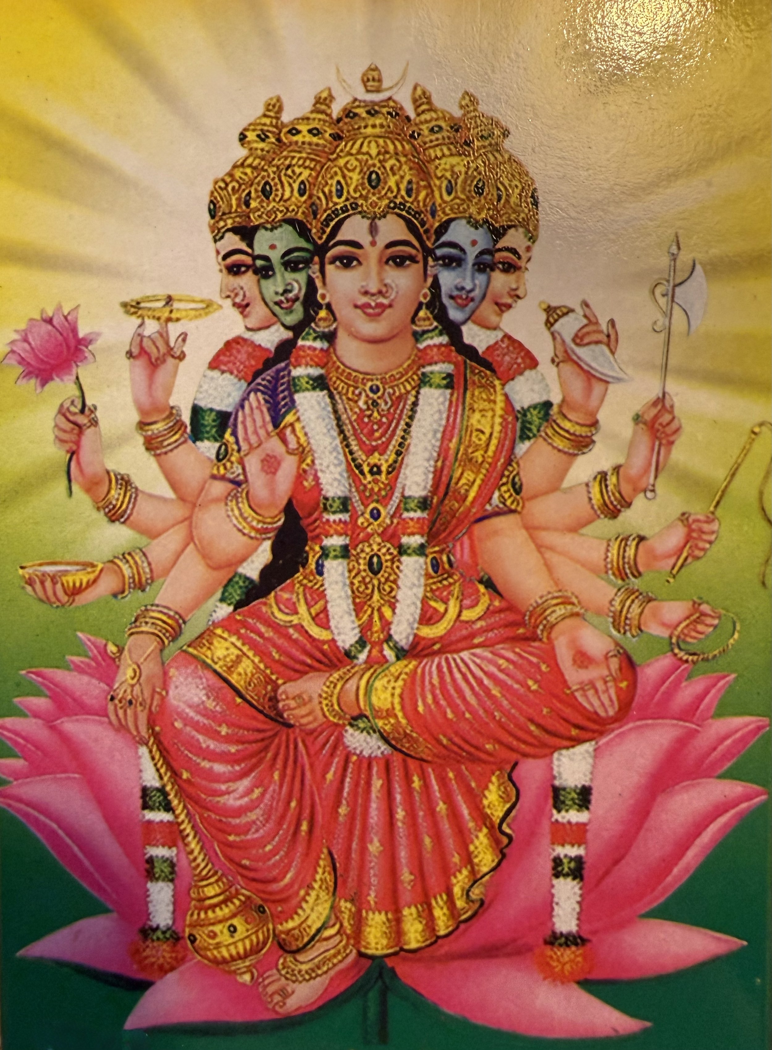 Her five faces, typically in gem-like colors, pearl (Mukta, white), coral (Vidruma, reddish), gold (Hema, yellow), blue (Neela), and white (Dhavala), represent mastery over the five pranas (vital life forces: prana, apana, vyana, udana, samana), which sustain breath, energy, and life itself; the five elements (earth, water, fire, air, ether), signifying her command of the entire material universe; and sometimes the five parts of the Gayatri Mantra or aspects of Vedic knowledge.