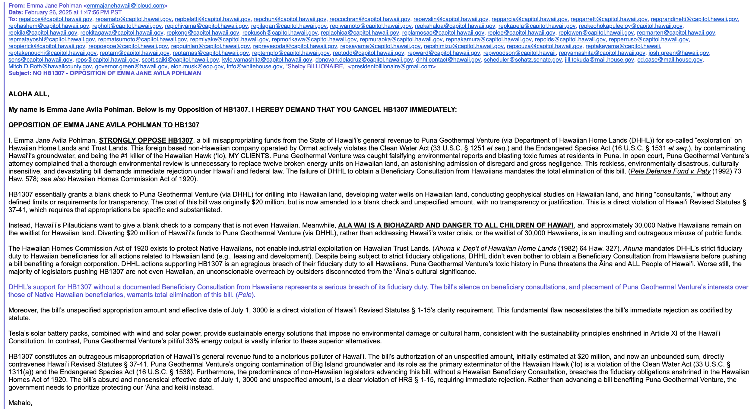 I, Emma Jane Avila Pohlman, STRONGLY OPPOSE HB1307, a bill misappropriating funds from the State of Hawai'i’s general revenue to Puna Geothermal Venture (via Department of Hawaiian Home Lands (DHHL)) for so-called “exploration” on Hawaiian Home Lands and Trust Lands. This foreign based non-Hawaiian company operated by Ormat actively violates the Clean Water Act (33 U.S.C. § 1251 et seq.) and the Endangered Species Act (16 U.S.C. § 1531 et seq.), by contaminating Hawai’i’s groundwater, and being the #1 killer of the Hawaiian Hawk (‘Io), MY CLIENTS. Puna Geothermal Venture was caught falsifying environmental reports and blasting toxic fumes at residents in Puna. In open court, Puna Geothermal Venture’s attorney complained that a thorough environmental review is unnecessary to replace twelve broken energy units on Hawaiian land, an astonishing admission of disregard and gross negligence. This reckless, environmentally disastrous, culturally insensitive, and devastating bill demands immediate rejection under Hawai’i and federal law. The failure of DHHL to obtain a Beneficiary Consultation from Hawaiians mandates the total elimination of this bill. (Pele Defense Fund v. Paty (1992) 73 Haw. 578; see also Hawaiian Homes Commission Act of 1920).